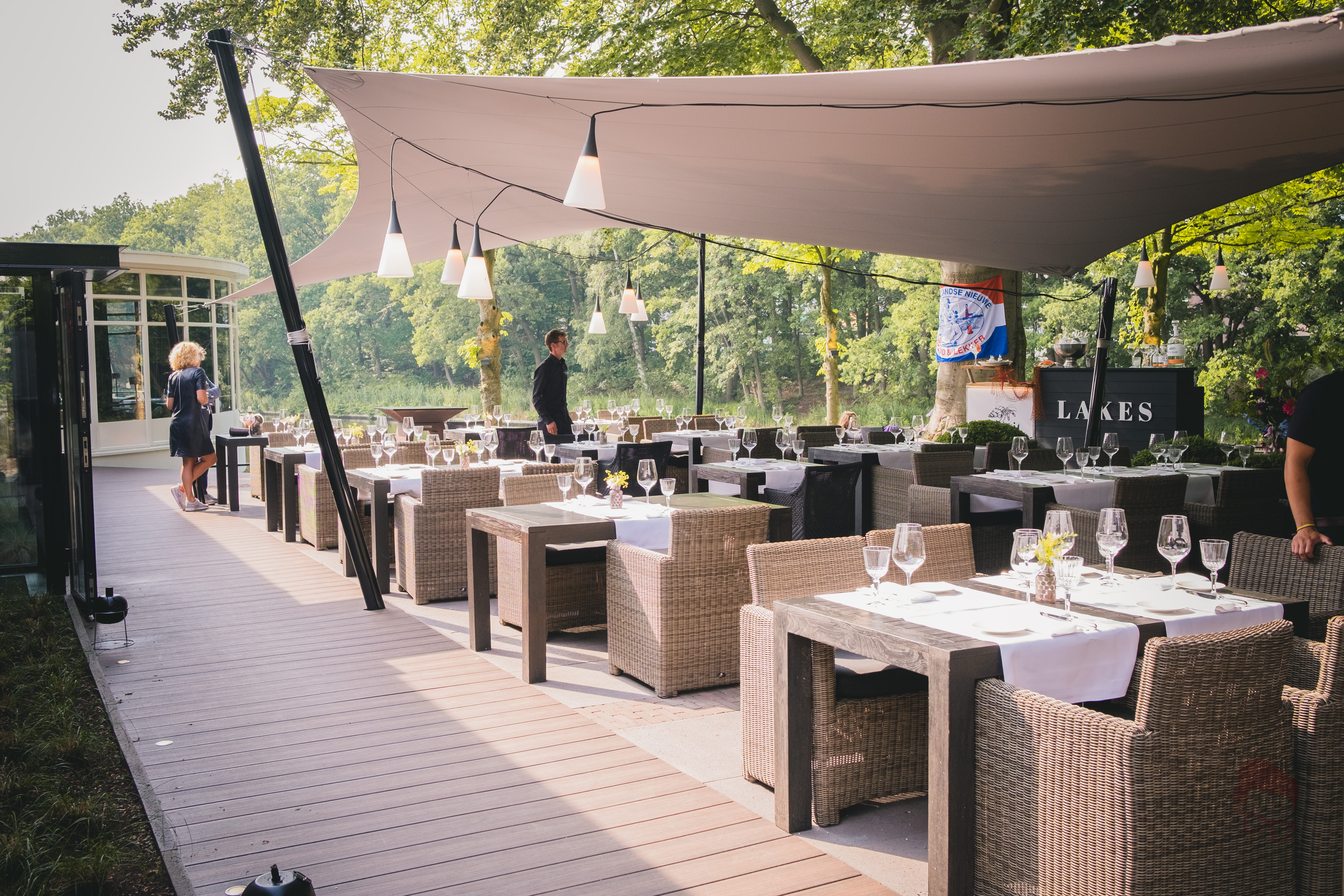 Lakes vinden we op een mooie locatie aan het Hilversums Kanaal met een prachtig groot terras met verschillende niveaus. Het meubilair is in perfecte staat; fraaie loungestoelen aan het water en een schommelbank.