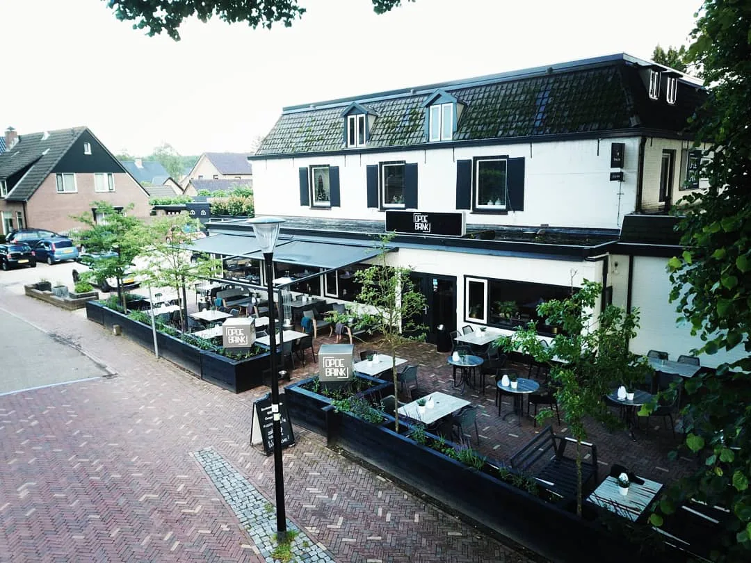 Het terras van restaurant Op de Brink, op de Veluwe, is keurig verzorgd en het verschillende meubilair is op elkaar afgestemd qua stijl en kleur. Ook zien we een mooie terrasafscheiding met verschillende bomen en planten.