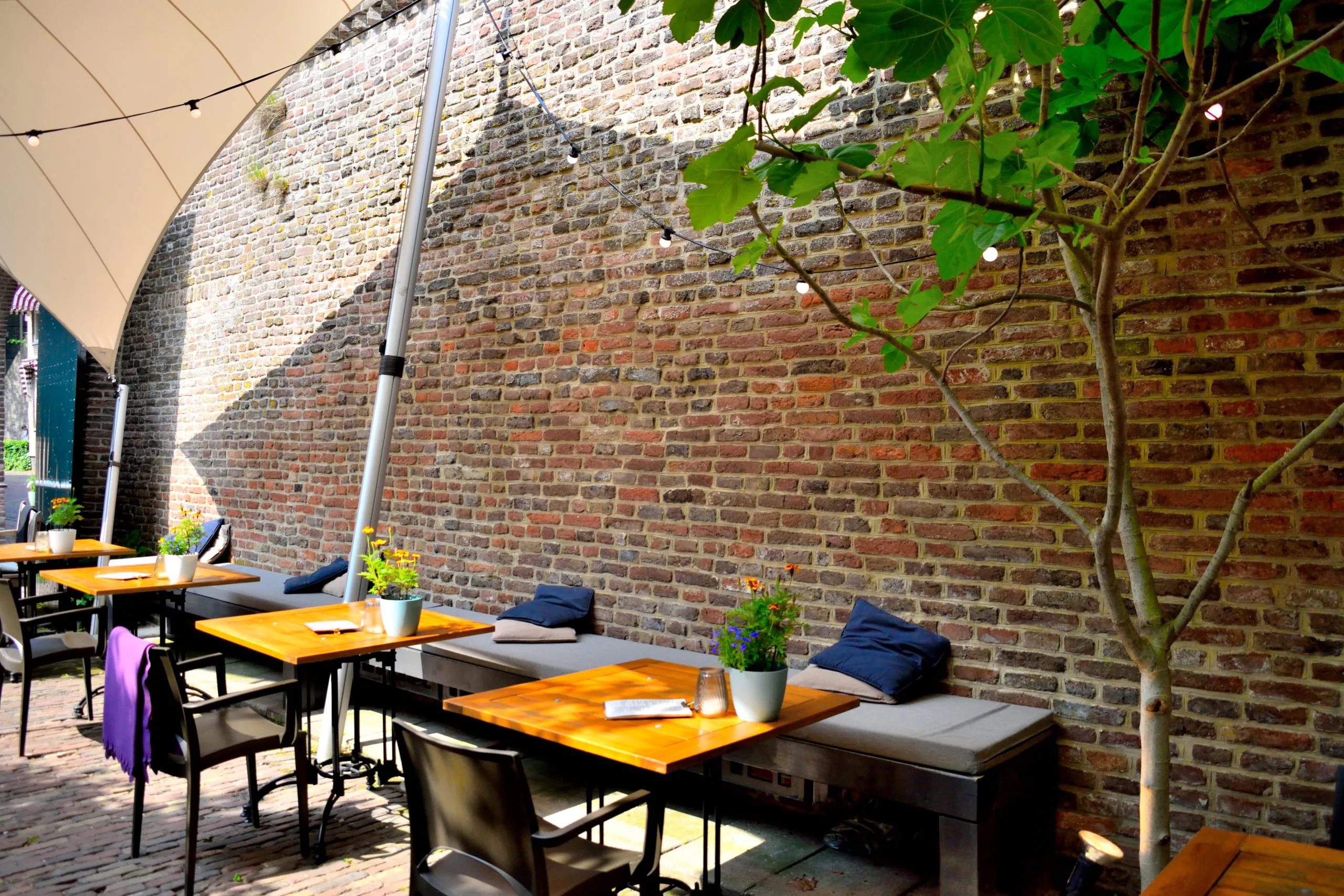Dit is een plaatje van een terras: een fraaie ommuurde binnentuin achter een oud pand in het centrum van Zevenaar. Mooie rustiek, een grote buitenbar, diverse houten tafeltjes, verlichting en groen, alle tafels zijn gedekt met een kaars en bloempot met verse bloemen.