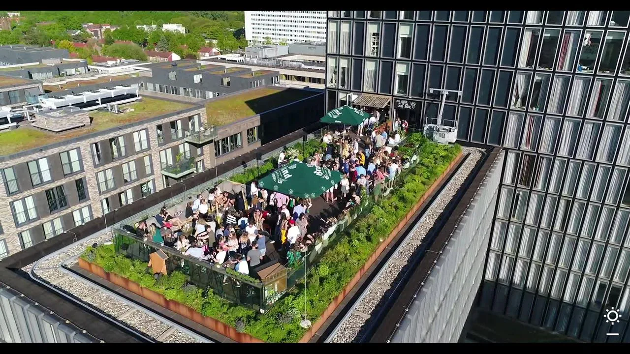 Dit is een mooi terras met houten tafels, hoge en lage zitjes, loungemeubilair, pallets en hangstoelen. Dat alles op de achtste verdieping op het dak van Hotel Casa. Om het terras heen en ook op het terras veel groen en glazen wanden. Dat maakt 't geheel af.