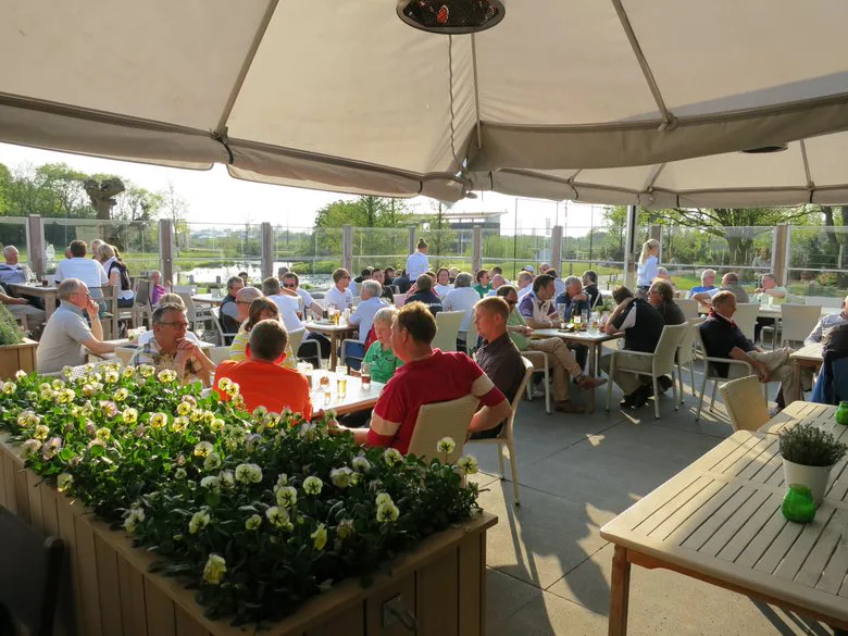Een zeer aangenaam terras temidden van een groen landgoed. Het frisgroen van het gras van de golfgreen wordt prettig gecontrasteerd door de fleurigheid van bloemen op het terras.