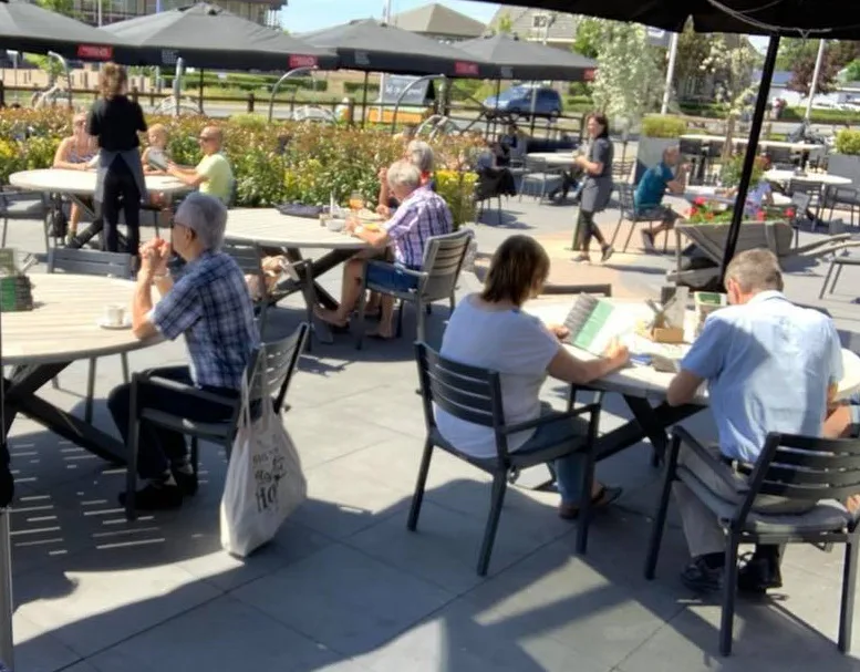 Dat dit vooral een restaurantterras is, zien we aan wat op tafel staat. Of eigenlijk aan wat er níet op staat: de tafels zijn maagdelijk. Tot er gasten plaatsnemen, dan worden vlot servet, bestek en glazen geplaatst.