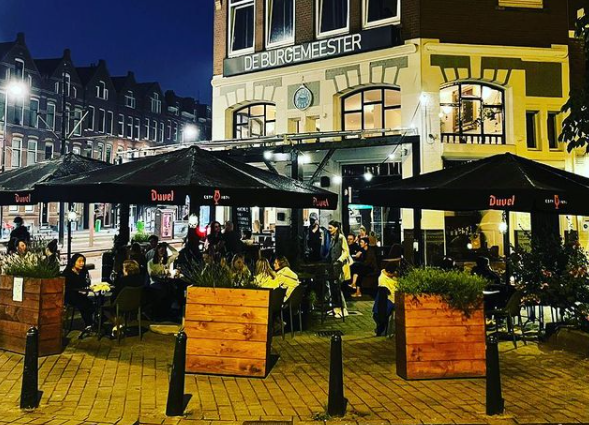 In het westen van Rotterdam vinden we De Burgemeester. Het terras staat er keurig bij: hoge zits worden afgewisseld met lage en het terras word afgeschermd met bloembakken.