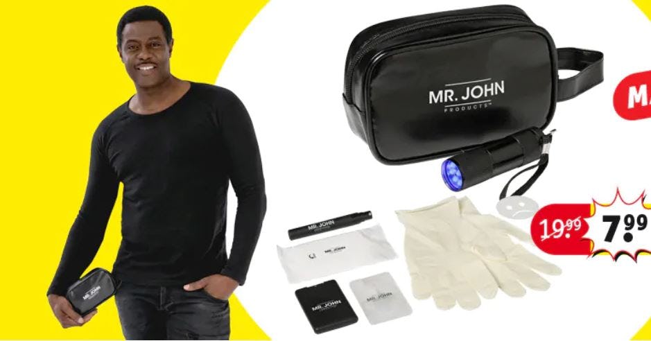 Presentator John Williams brengt een schoonmaaktasje op de markt dat hij presenteert als 'hulp bij vieze hotelkamers.' Het gaat om de Mr. John's Travel Hygiene kit. Het tasje kost bijna 8 euro en bevat onder meer een schoonmaakdoekje en een uv-lamp.