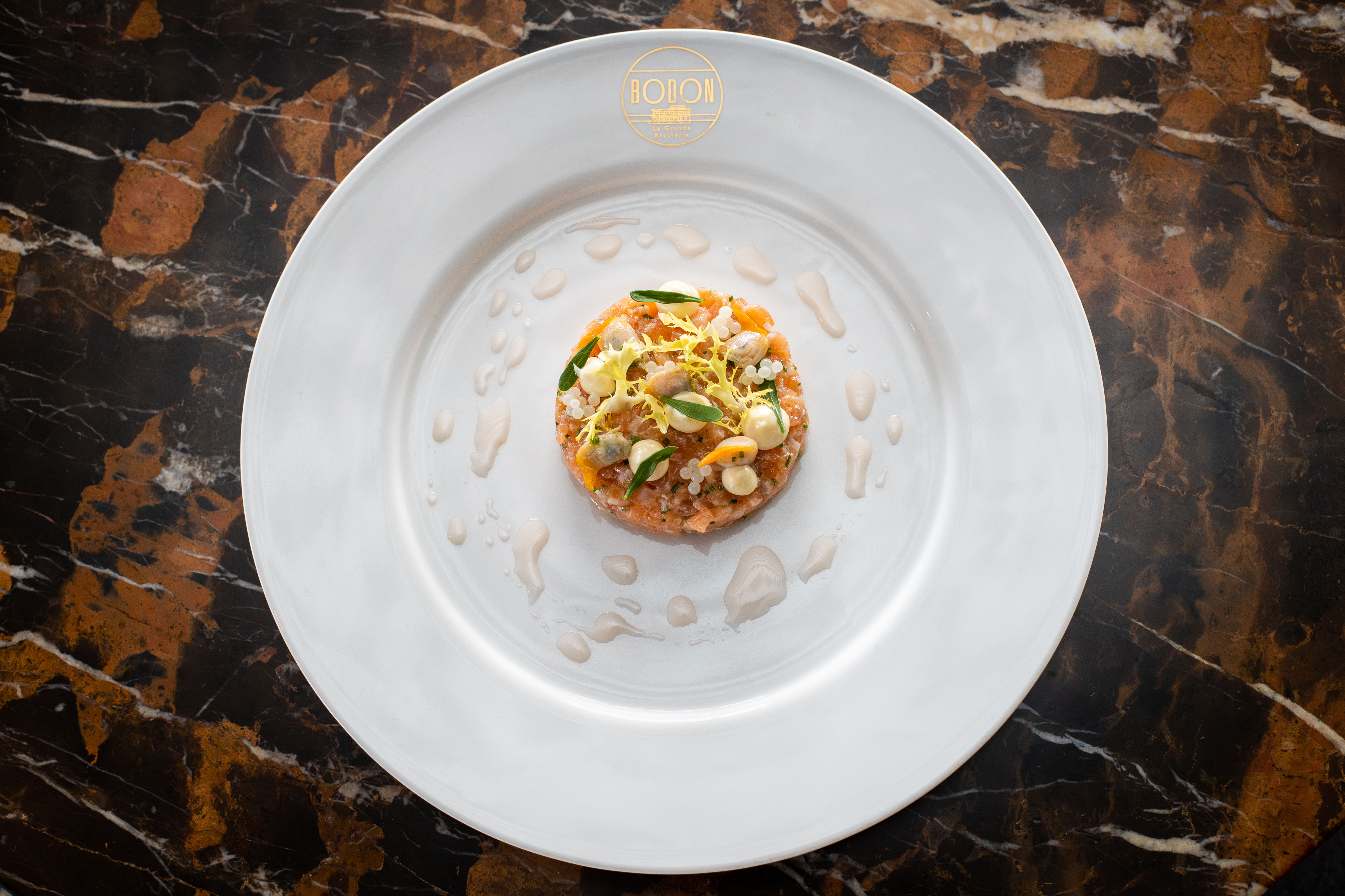 Recept tartaar van Kvitsoy Zalm met gemarineerde schelpjes, slakken kaviaar en langoustine-mayonaise.