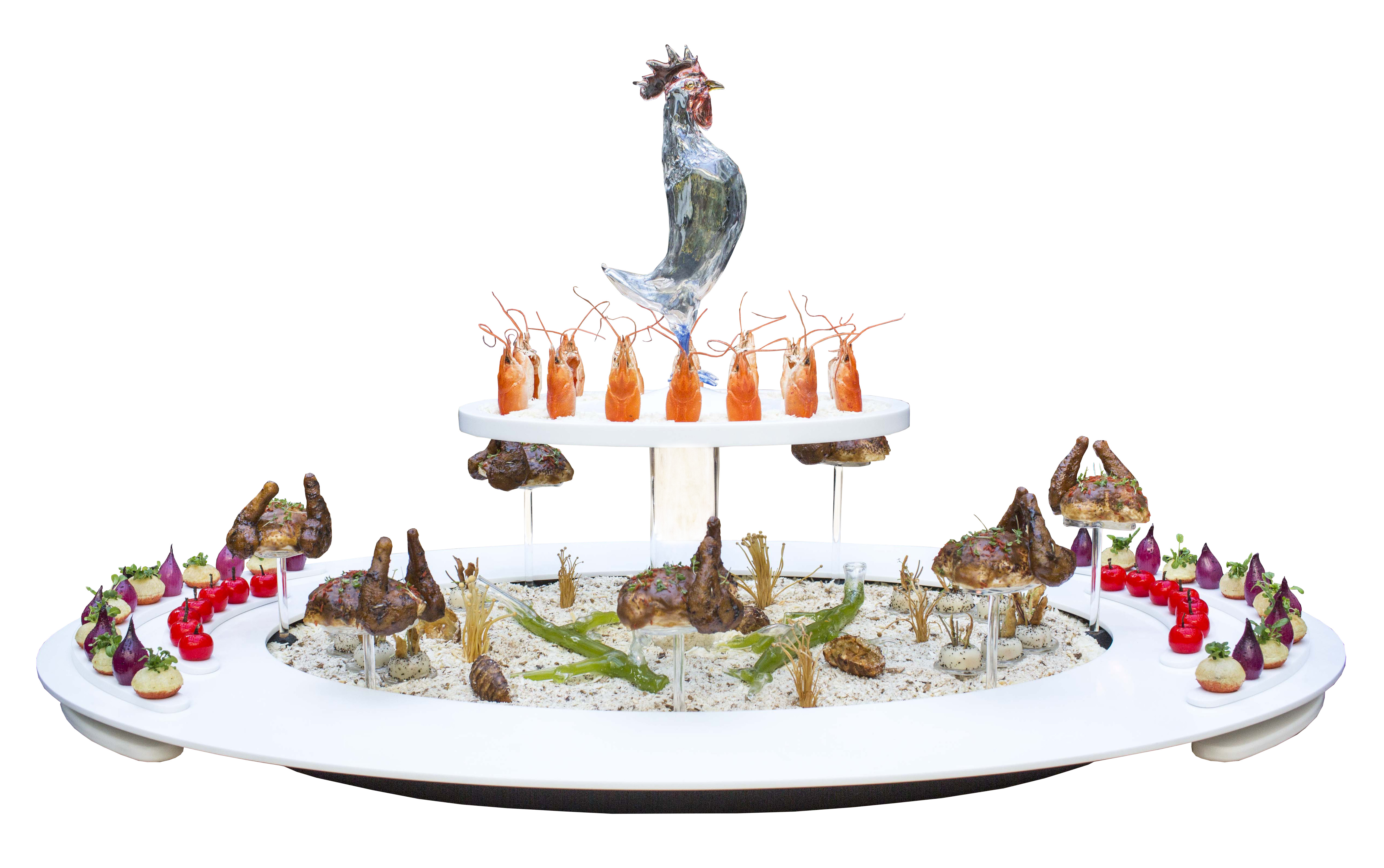Foto's uit de wedstrijdkeuken van de Bocuse d'Or, inclusief de gerechten.