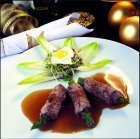 Met kruidnagel en zwarte peper gegaarde wilde eend, geserveerd met een mousseline van pijnboompitten, een compote van vijgen en een terrine van gekonfijte bout en kastanjechampignons. Begeleid door een saus van PX-sherry en een sherrysabayon.