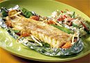 Ingrediënten voor vier personen: 12 stukjes zeeduivelfilet (50 g elk) 3 eetlepels slaolie 2 preien 1 rode paprika 4 plakjes ontbijtspek 1 teentje knoflook zout, peper 4 eetlepels geconcentreerd sinaasappelsap(diepvries) 4 eetlepels dikke kokosmelk