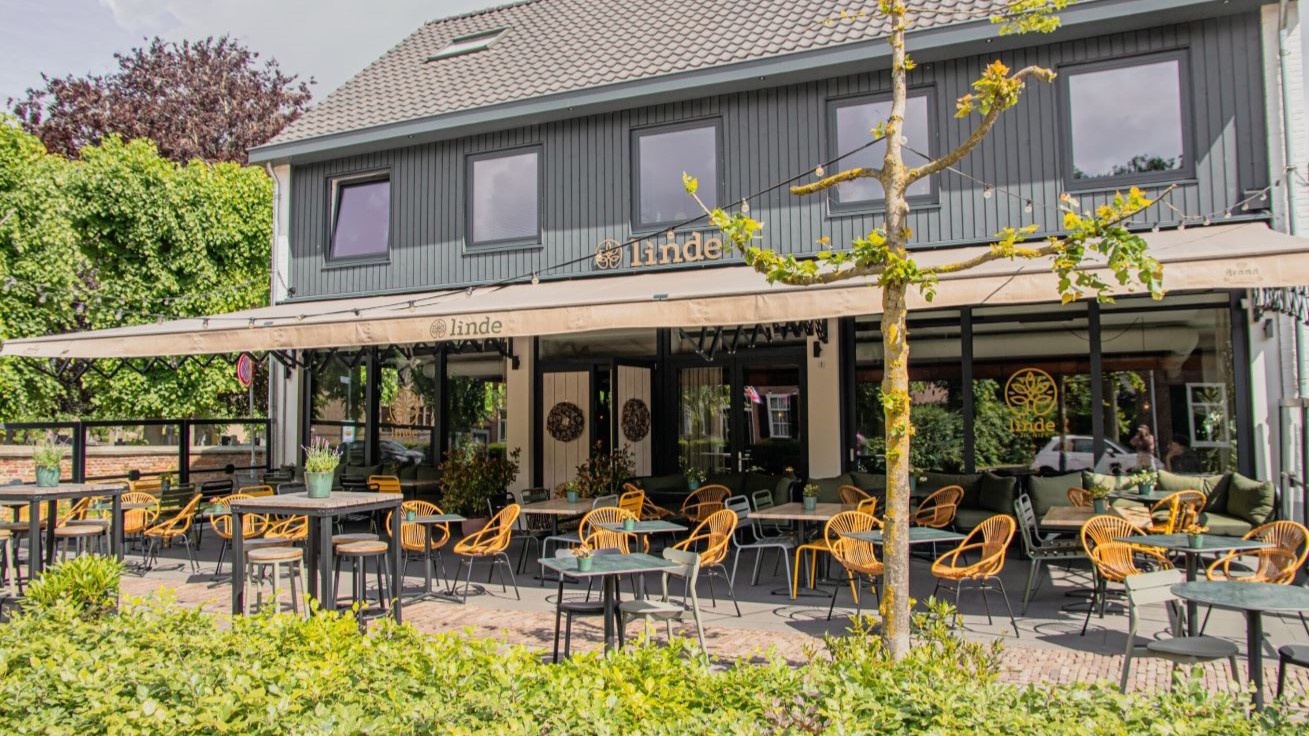 Een uitnodigend terras midden in het bos, waar witte tafeltjes en rieten stoelen harmonieus passen bij de natuurlijke omgeving. Het terras aan de voorzijde straalt gastvrijheid uit. Ook het pleintje met de leuke koffietruck zijn 'sfeerverhogend'.