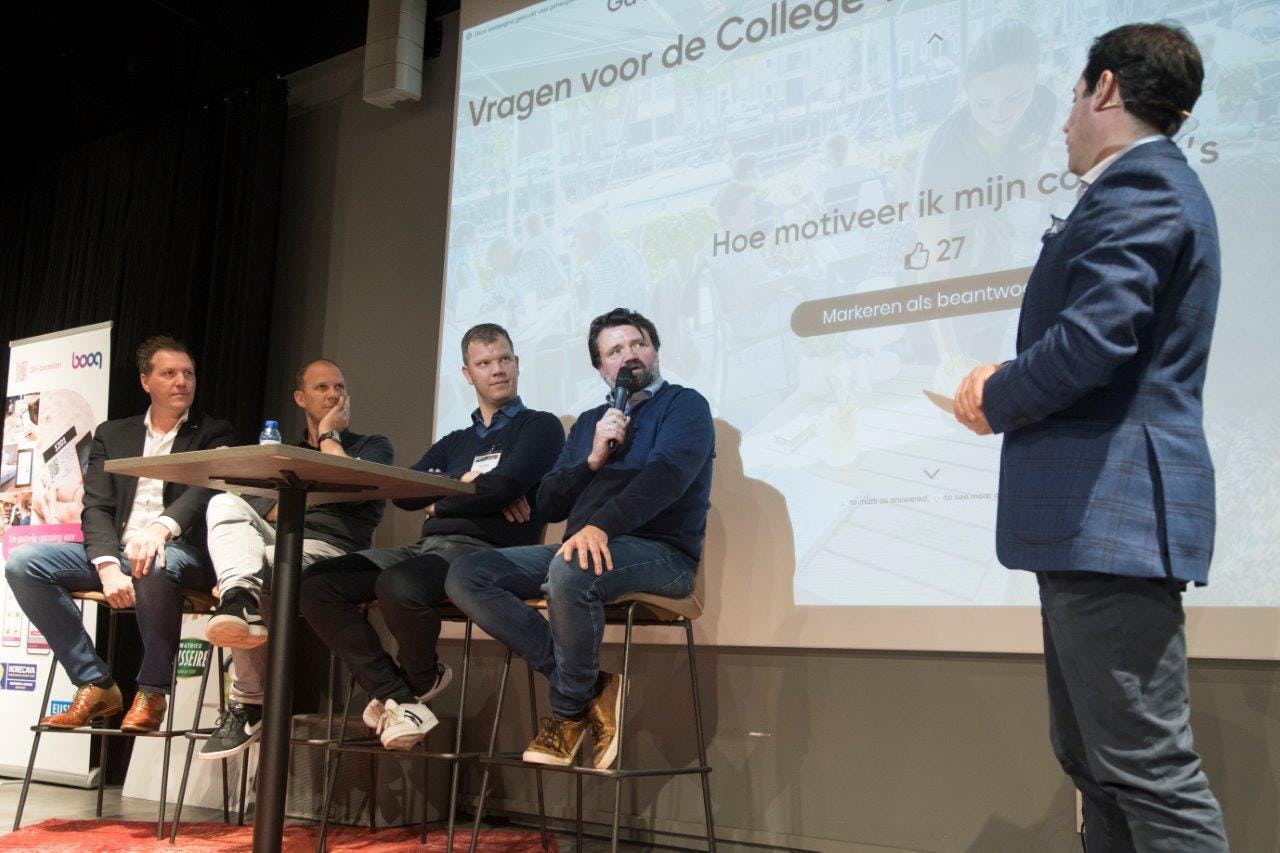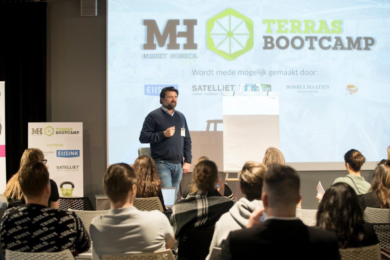 Ruim 200 gasten konden maandag 9 maart tijdens de 'College Tour' op de Terras Bootcamp hun prangende terrasvragen stellen over hun terras aan de ondernemers van Terras Top 100-winnaars De Boterlap in Harderwijk en De Werf in Veere. Ook gastvrijheidstrainer Frank Heijneman van de Gast is Koning gaf er zijn visie.