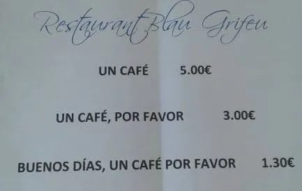 De eigenaresse van eetcafé Blau Grifeu in het Spaanse vissersplaatsje Llançà heeft een bijzondere aanpak om haar gasten op te voeden. Wanneer er niet met twee woorden wordt gesproken, betaalt de gast er meer voor een kopje koffie.