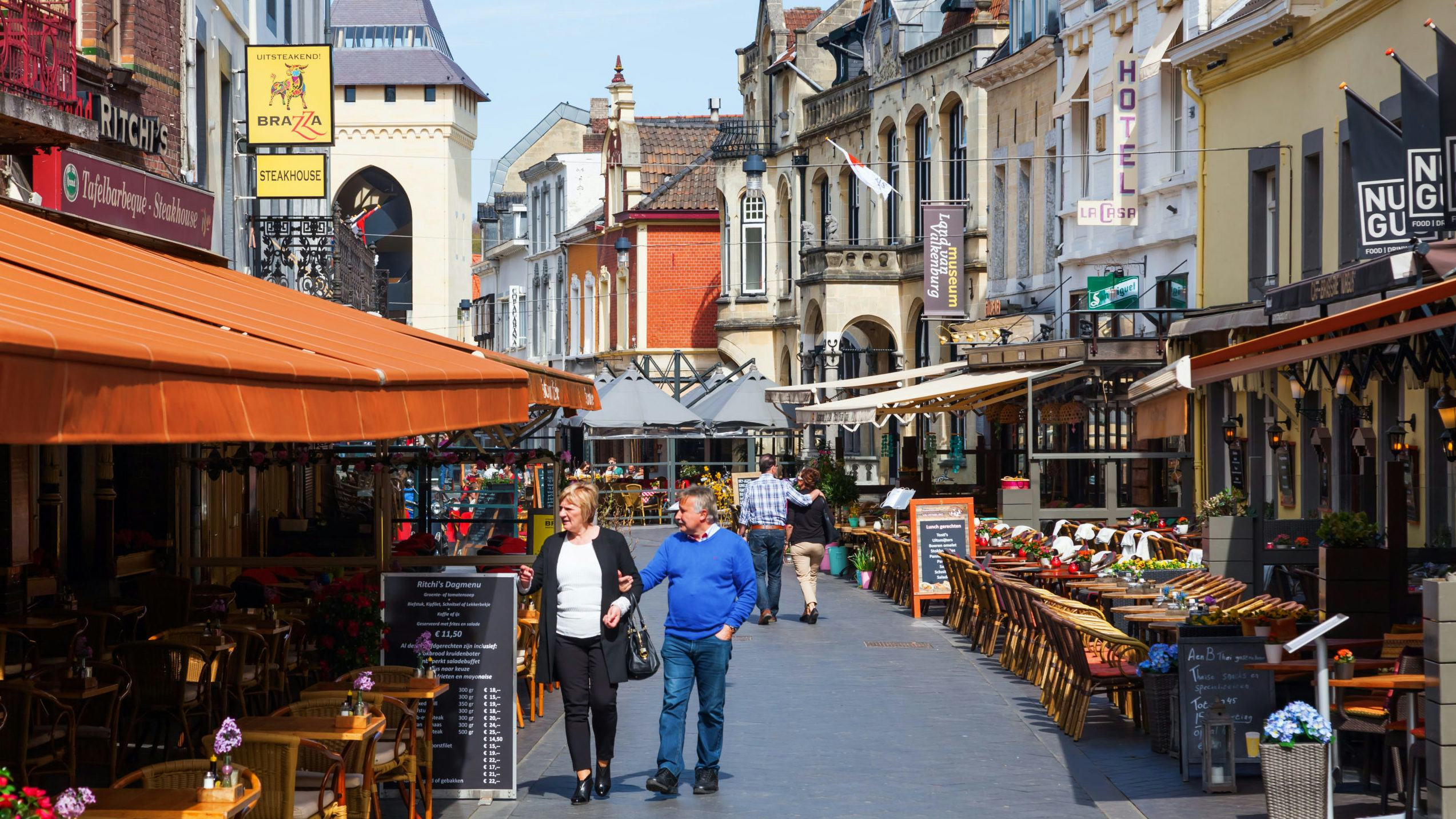 Veel mensen zitten vrijdag op een terras bij de geopende horeca in Valkenburg. Om 10.00 uur gingen de terrassen open, net als de café's, restaurants en winkels in het Valkenburgse stadscentrum.