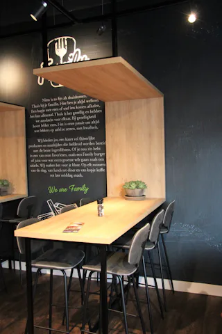 Waar sommige Family-vestigingen van een bestaande cafetaria worden omgebouwd naar formulestijl was Family Maarssen tot voor kort een volledig casco pand. Dat betekende dat alles moest worden verbouwd en ingericht. Iedere vierkante meter kon daardoor een duidelijk doel krijgen. Zo is er een ijshoek gecreëerd voor de warme dagen en is er voldoende zitruimte voor gasten.