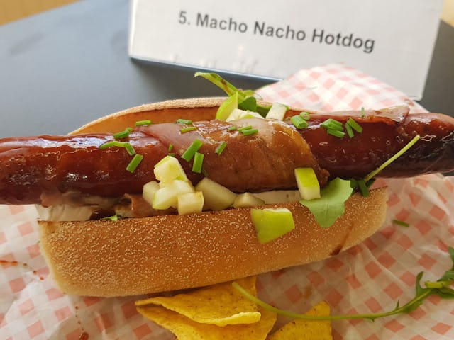 Richard Theisen van HMSHost won brons met de Bekroning: een rendang knakworst met Oosterse cress mix, atjar Ferlyan, rendang spread en gebakken ui. Het was voor hem alweer de derde prijs vandaag, na het brons tijdens het Lekkerste Lunchgerecht Horeca en de vegetarische prijs in diezelfde categorie. Een mooie afsluiting voor Theisen, die voor het 25e opeenvolgende en laatste jaar meedeed. In totaal deden er dit jaar negen kandidaten mee met de Lekkerste Hotdog.