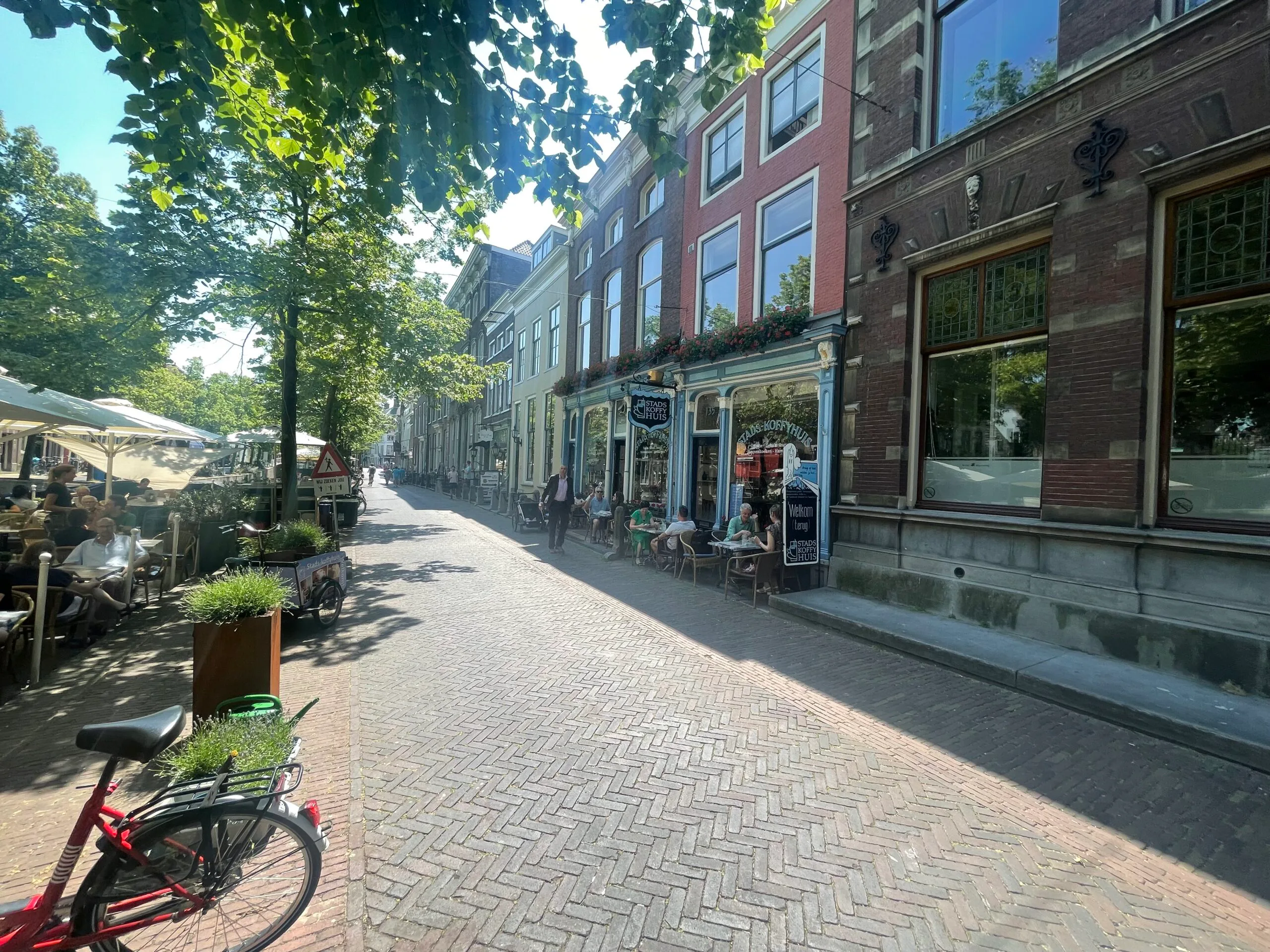 Het terras van Stads-Koffyhuis, wat merendeel een boot is, ziet er zeer verzorgd uit. Om de boom, die van de gemeente is, hebben ze plantjes gepland, wat er erg gezellig uitziet.