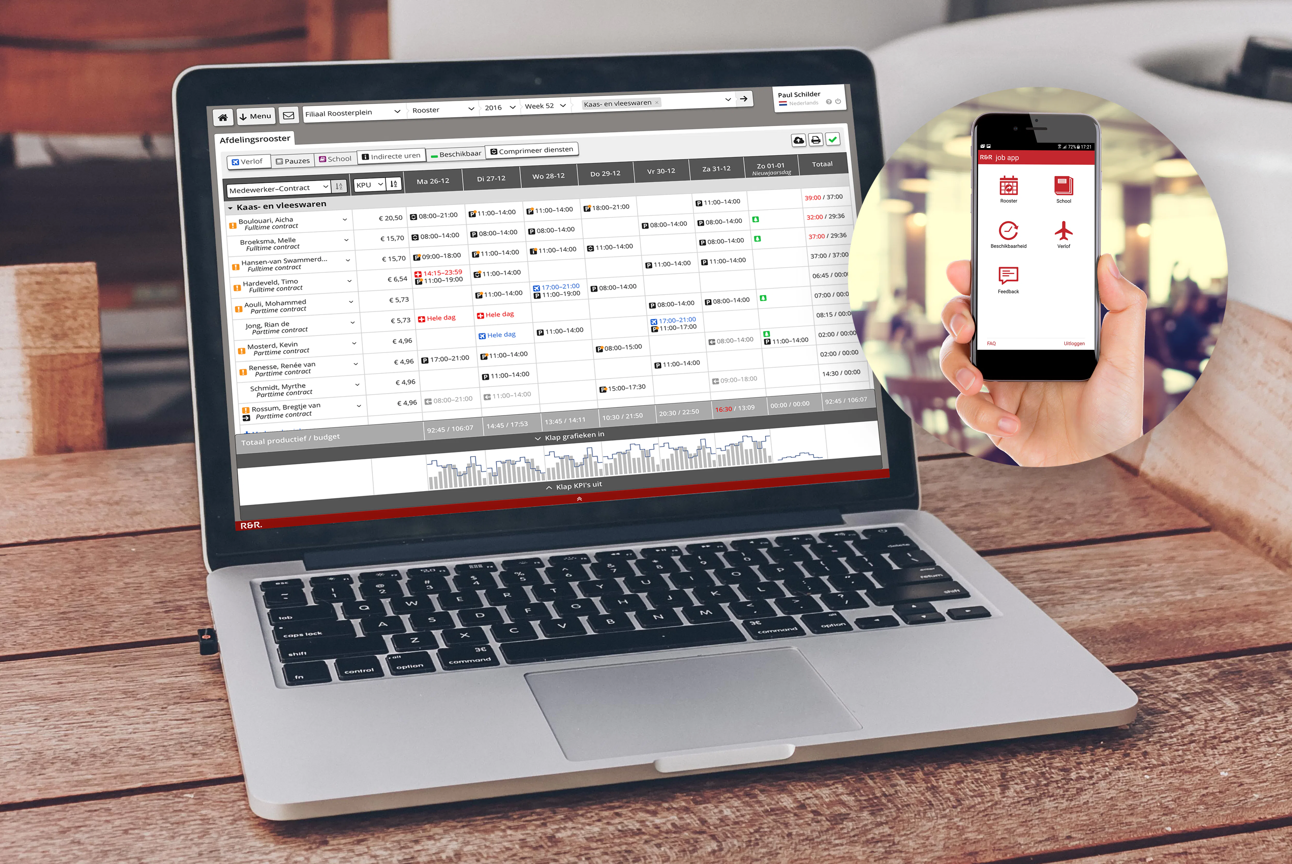 Met R&R WFM kun je eenvoudig personeel inplannen op basis van eerdere omzetgegevens. Hierbij wordt gekeken naar het hele proces: van prognose en rooster tot realisatie en uitbetalen.