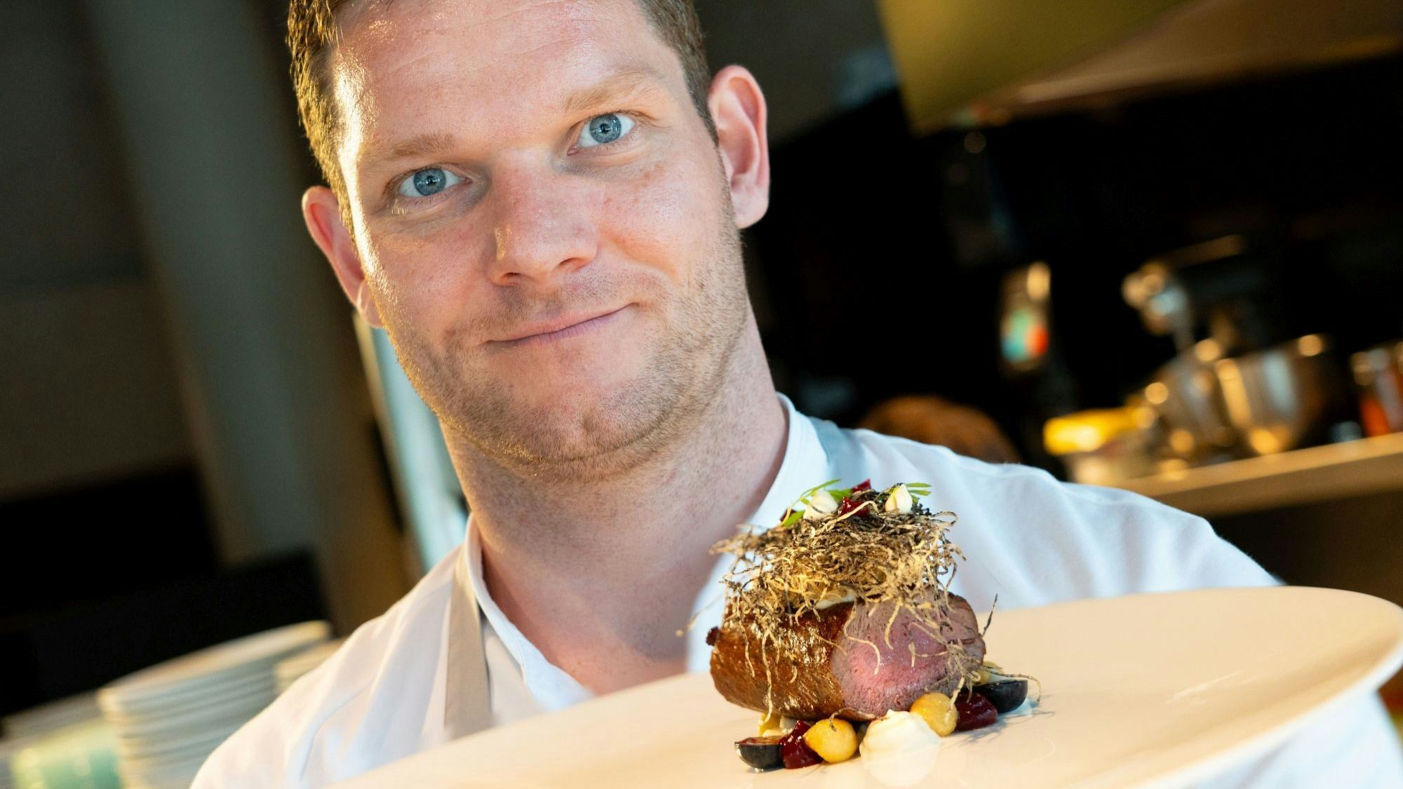 Dorus Floris en Lendl Mijnhijmer openden eind 2023 restaurant Showw*. Voor Misset Horeca bereidt Floris een gerecht van damhert met knolselderij, rode kool, sesam en blauwe bes.