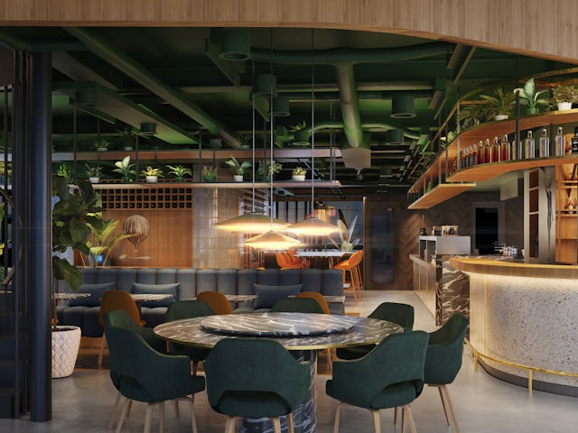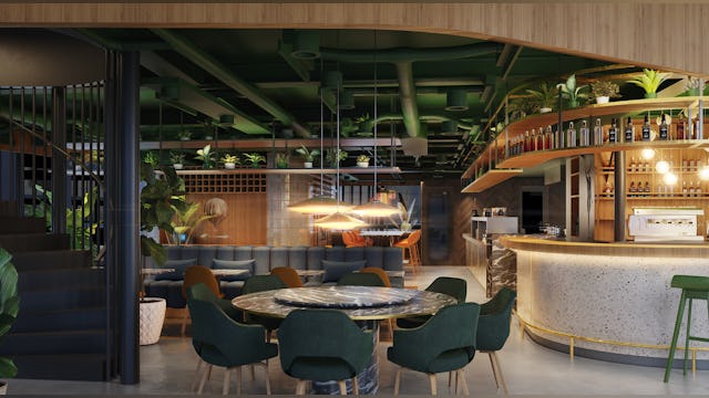 Het horecapaviljoen, naar ontwerp van Powerhouse Company, wordt ontwikkeld door OVG Real Estate en G&S Vastgoed. Studio BvanB tekende samen met de architect voor het interieur. Met de glazen pui met afgeronde hoeken, een houten dak en een oppervlakte van ruim 900 vierkante meter wordt het een opvallende verschijning. 'Voor de akoestiek nemen we speciale maatregelen.'