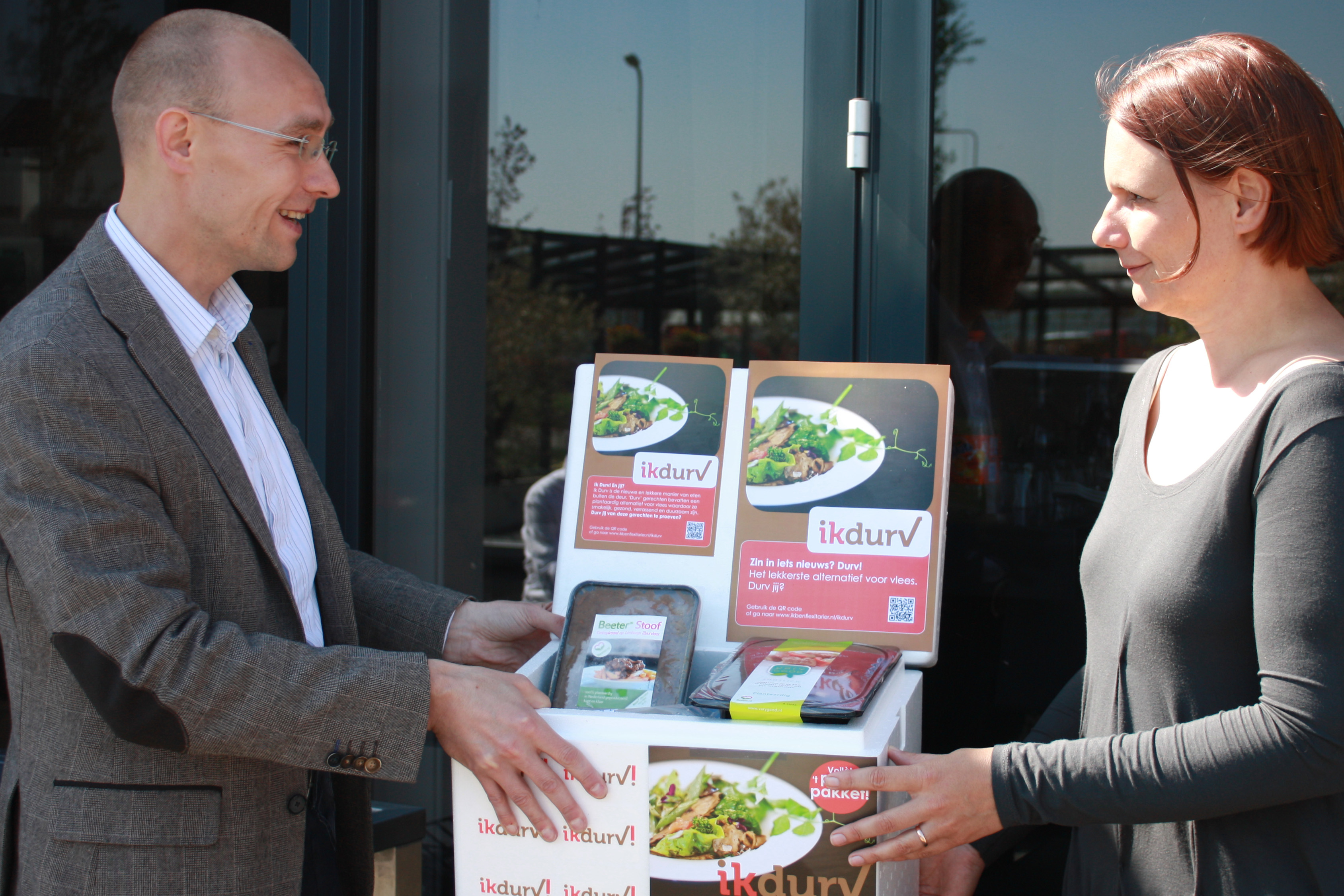 Met de overhandiging van het eerste proefpakket met plantaardige producten door Jeroen Willemsen van Beeter-producent Ojah aan Veneca-secretaris ...