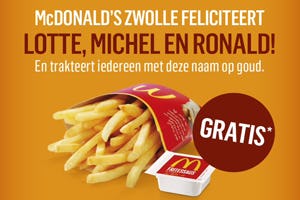 McDonald's Zwolle-Centrum haakt op ludieke wijze in op de plaatselijke huldiging van de Olympische medaillewinnaars. Bezoekers met de naam Lotte, Michel ...