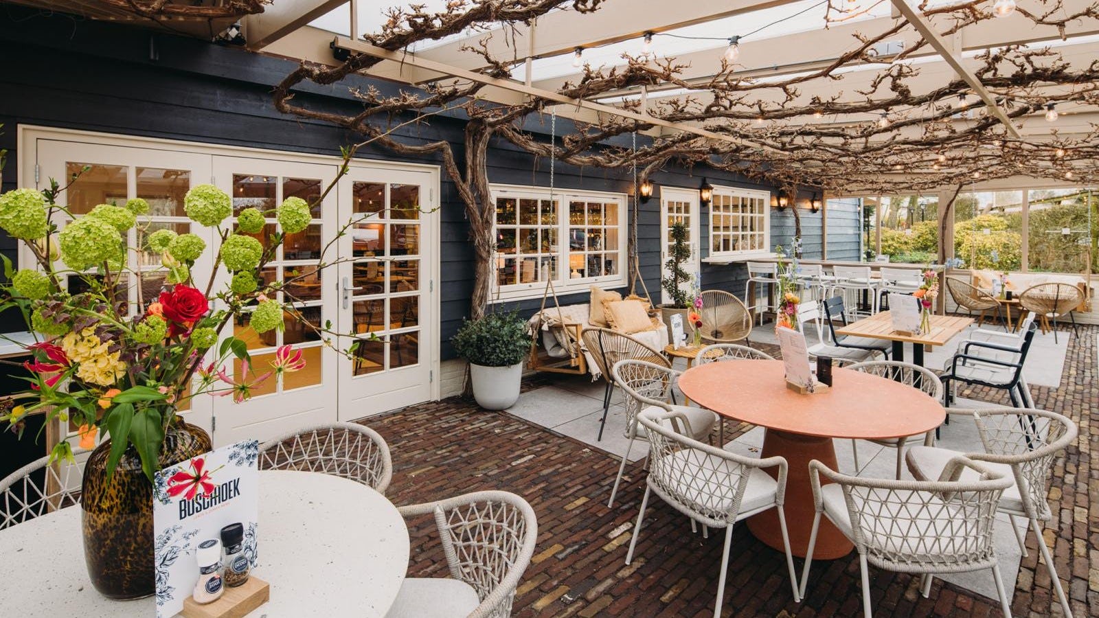 Een zeer vrolijk tuinterras met uitbundige bossen bloemen op de tafels. Hier word je blij van. Dat bij de entree wordt gevraagd om offline te gaan, is een leuke vondst.