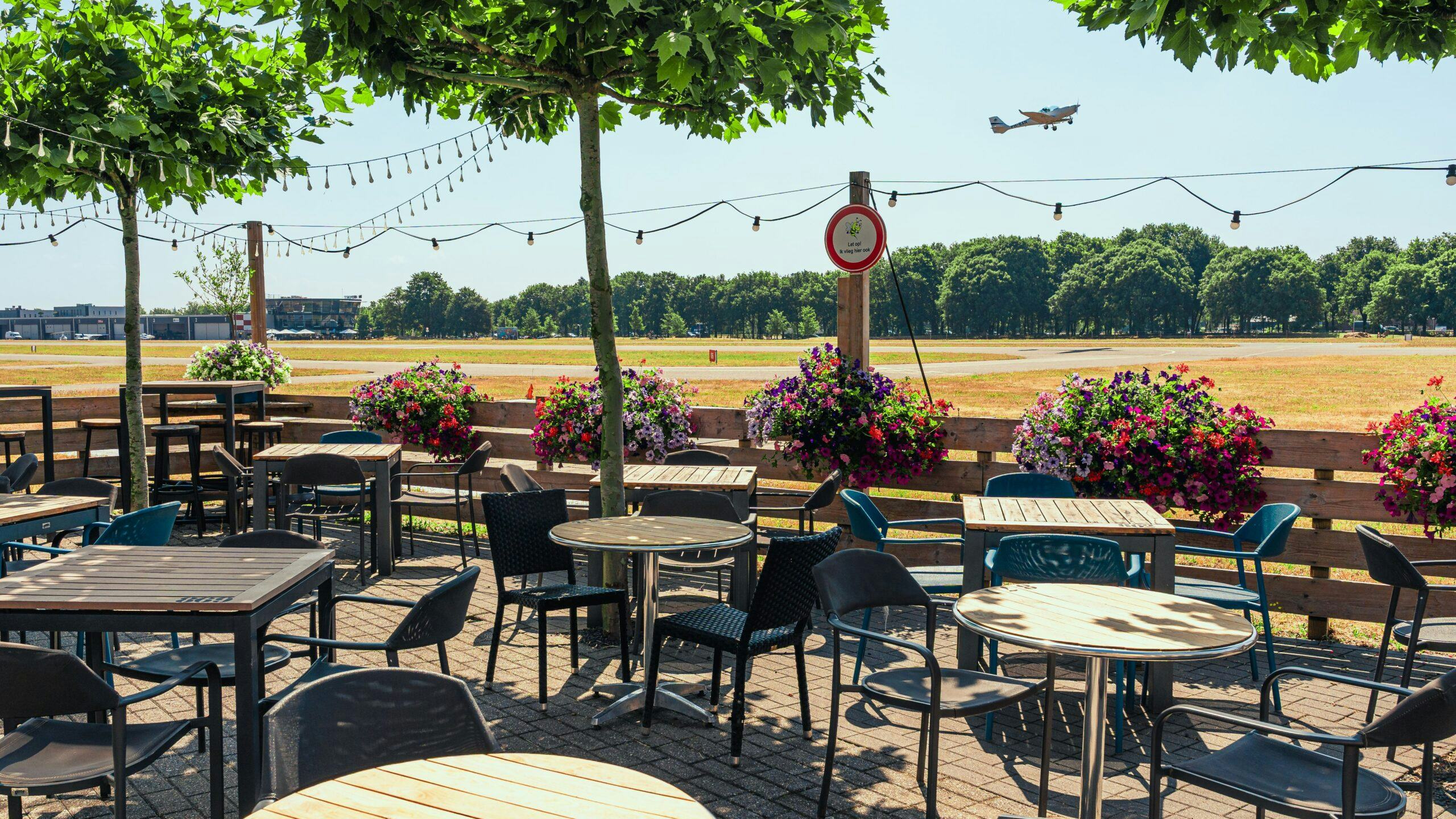 Het terras van restaurant de Cockpit ligt op een geweldige locatie, met een leuk uitzicht op de opstijgende vliegtuigen op de achtergrond.