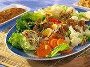 Ingrediënten voor 2 personen: 100 gram bloemkool 100 gram winterwortel 100 gram sperziebonen 100 gram gesneden kool 50 gram taugé 2 dl kant-en-klare pindasaus 1 krop sla 1 tomaat 3 hardgekookte eieren gefruite uitjes (fruitjes) kroepoek 200 gram rijst