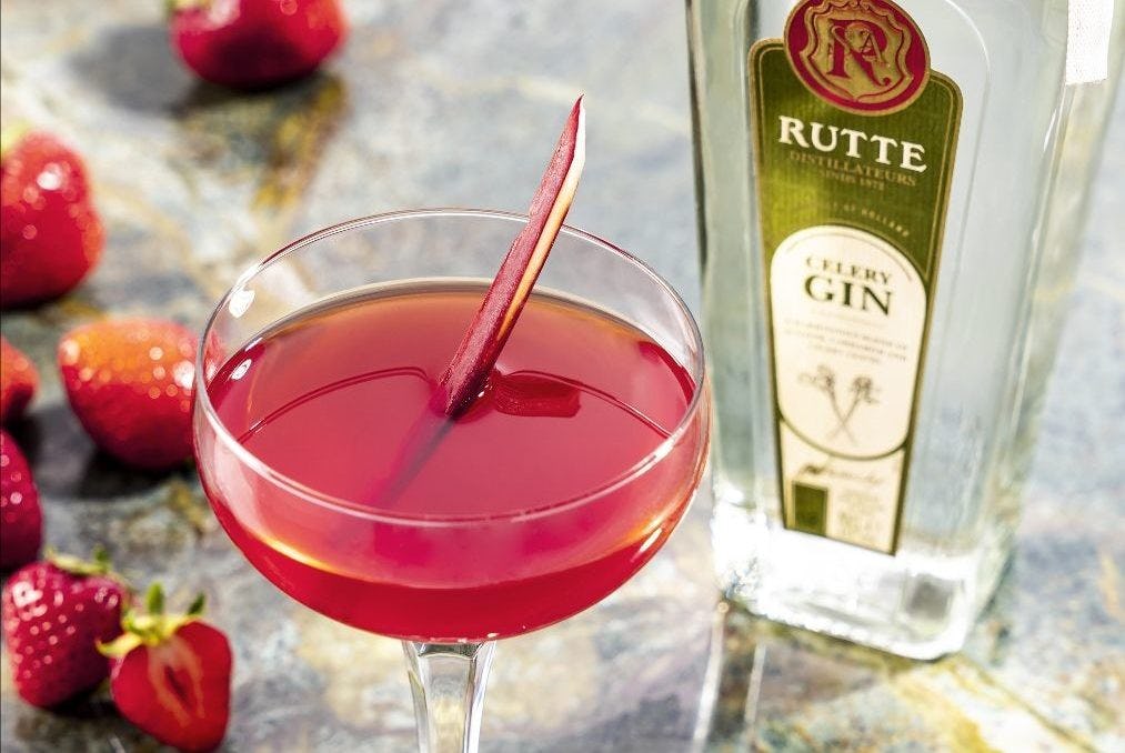 Dutch loveletter is een cocktail met Rutte Celery Gin. Het recept van Rutte's Master Distiller, Myriam Hendrickx, combineert zoete aardbeien met vanilletonen van de tonkaboon.