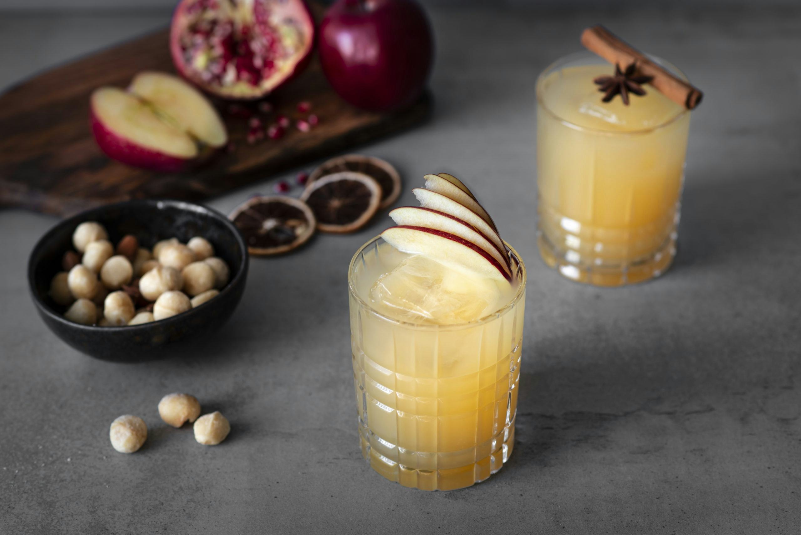 Macatopia is een cocktail met een explosie aan winterse smaken: appel en macademia (Australische noot), de sinaasappel van Triple Sec en tonen van gember, kaneel en mout van de Old Tom Genever. Maak de winterse cocktail zelf.