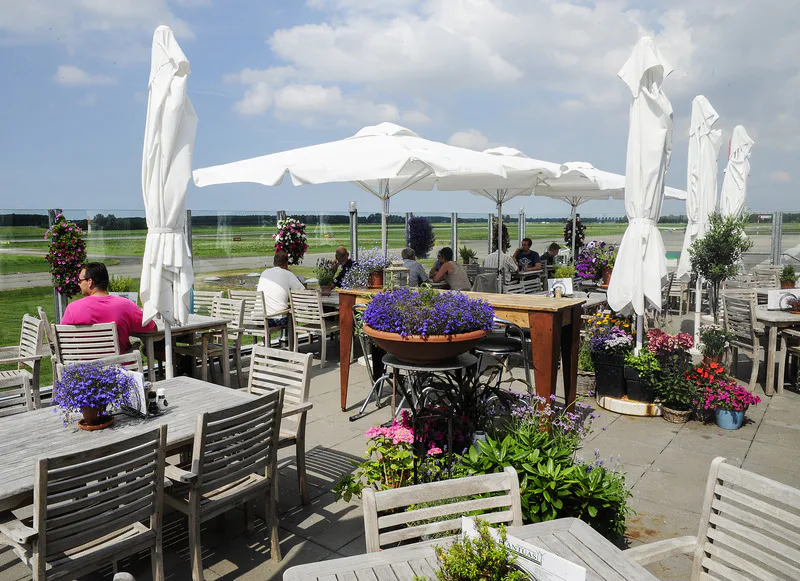 Slechts weinig terrassen in ons land kunnen tippen aan het uitzicht vanaf het dakterras van Flantuas: de start- en landingsbaan van wat binnen ...