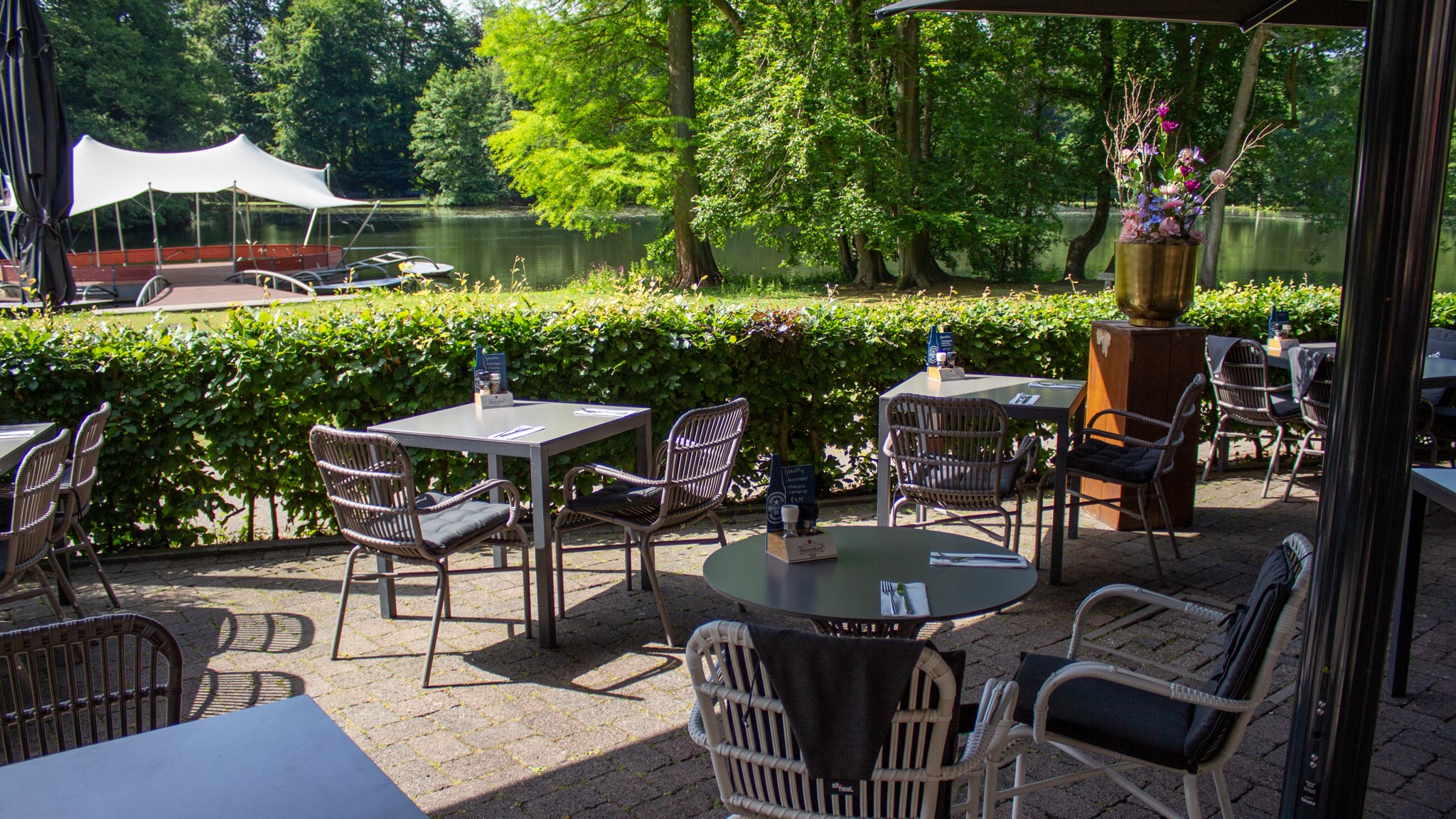 Het terras van Brasserie de Boerderij ziet er erg uitnodigend uit, is goed verzorgd en onderhouden. Stoelen hebben kussen met verwarmingsopties en het logo van de zaak.