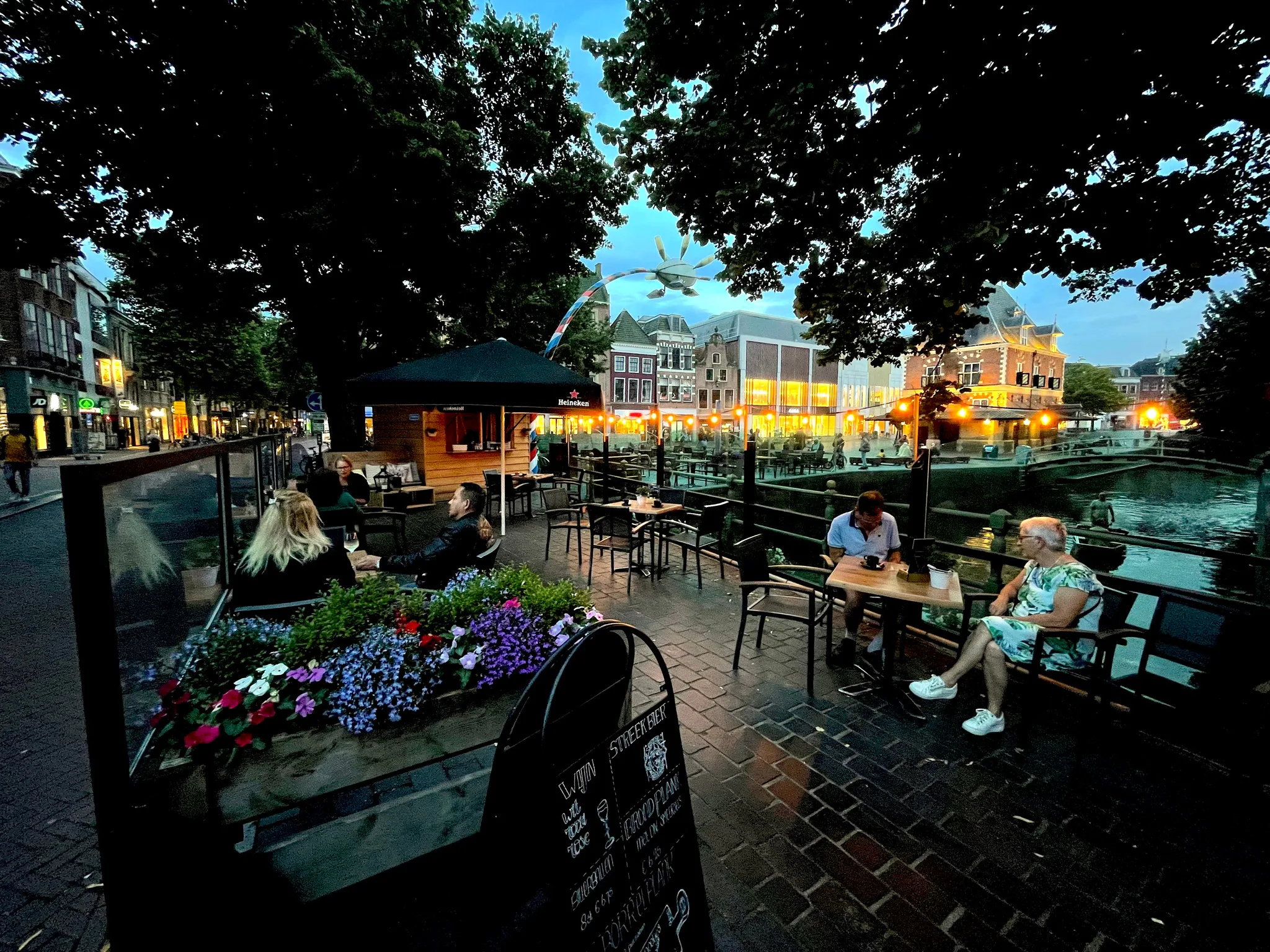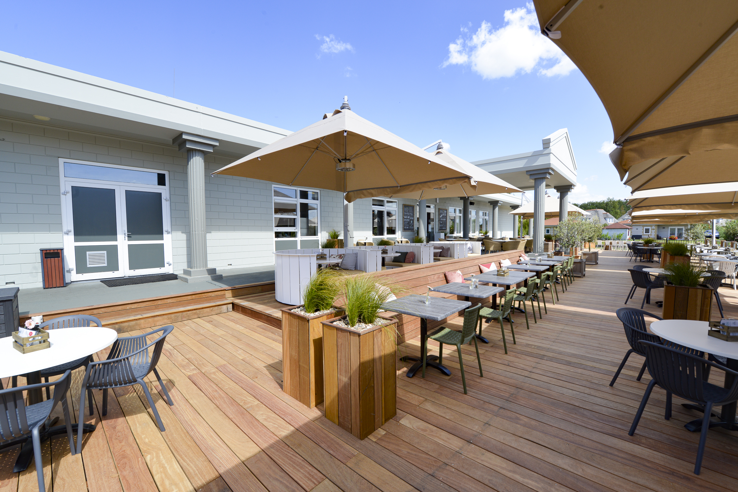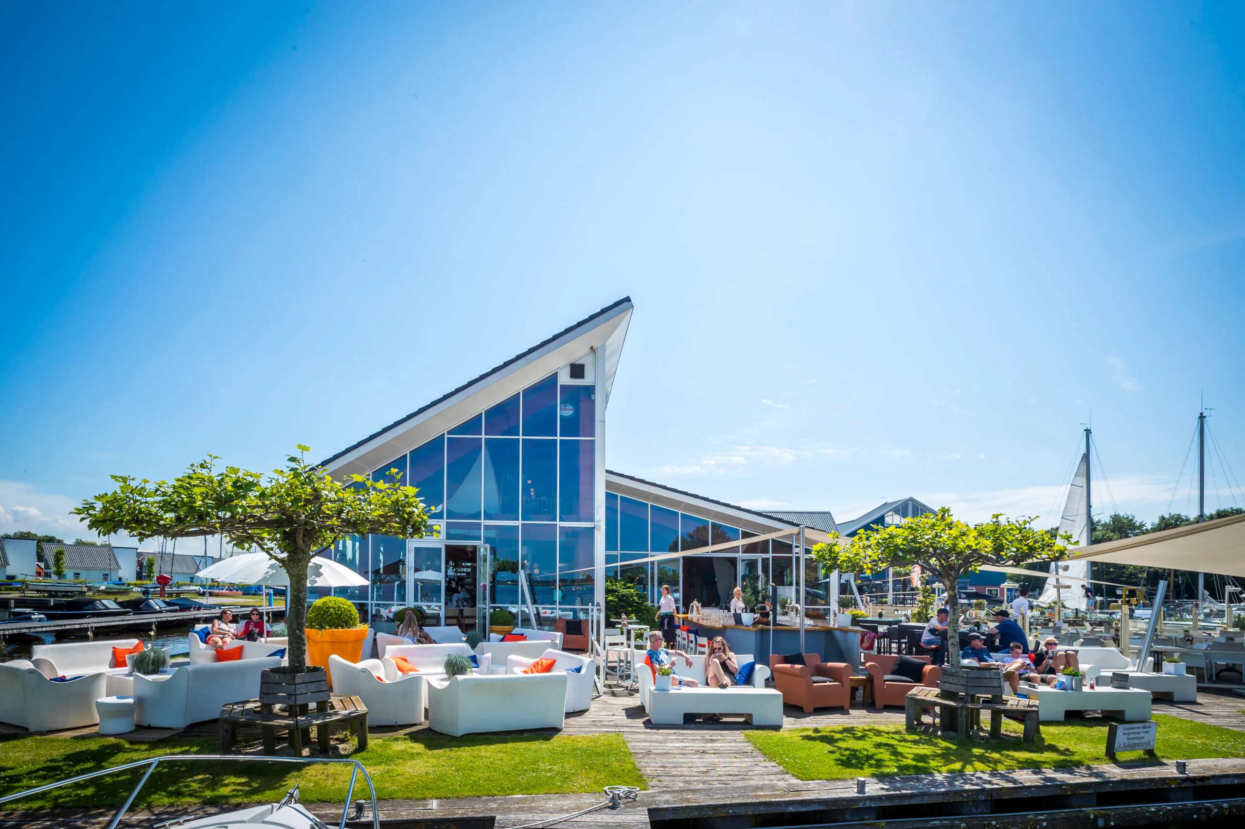 Een mooi robuust terras aan het water, waar hoge schermen de wind weghouden. Heerlijke Streken ligt middenin Blauwestad, een groot ontwikkelingsgebied net buiten het Groningse Winschoten.
