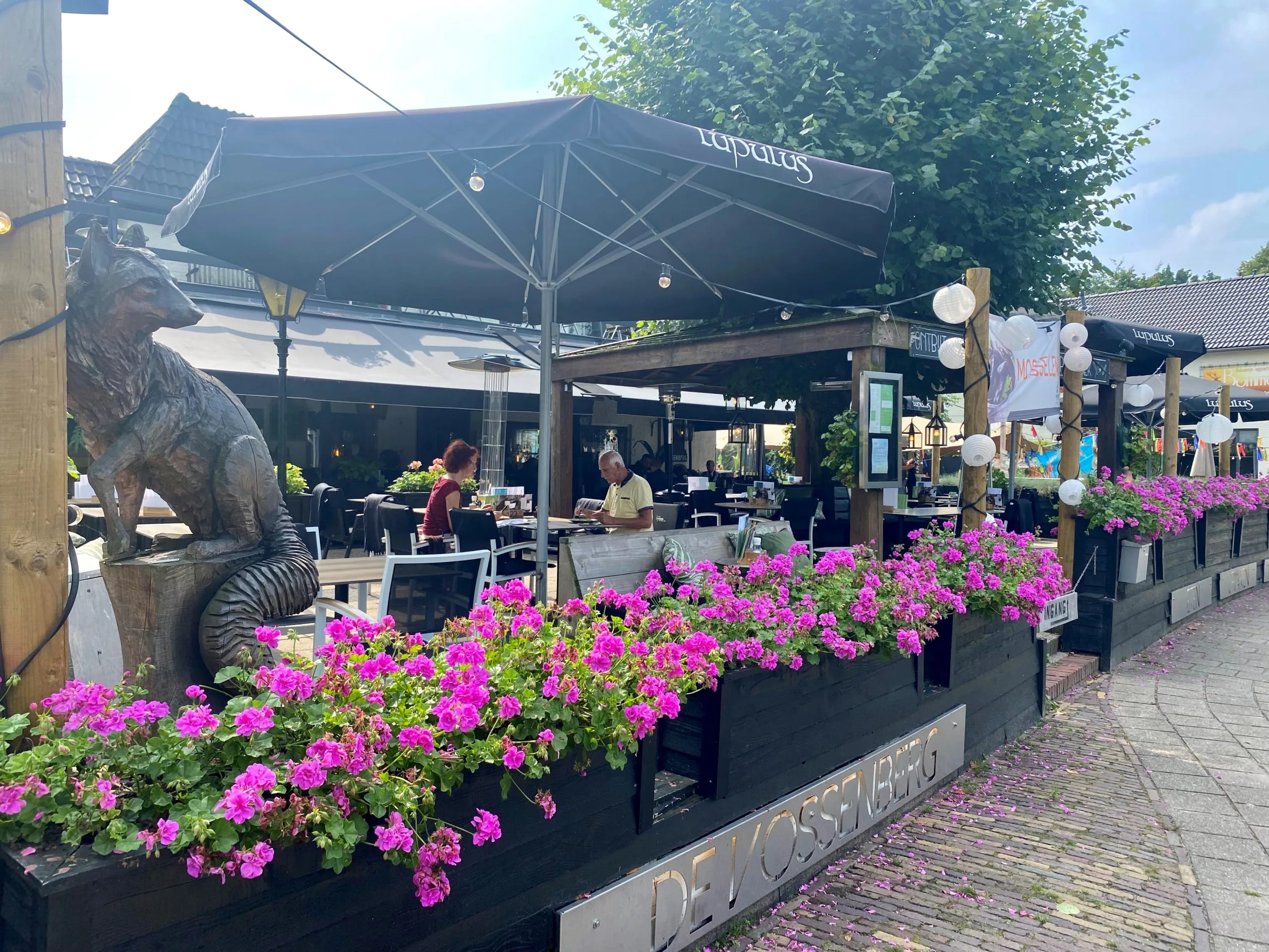 Het terras van De Vossenberg is ruim opgezet en over de stoelen zijn dekentjes gedrapeerd. Rondom het terras zien we kleurige planten, heaters en hondenbakken bij de ingang. Leuk ook dat fietsers daar hun bidon kunnen bijvullen en de banden oppompen. Attent!