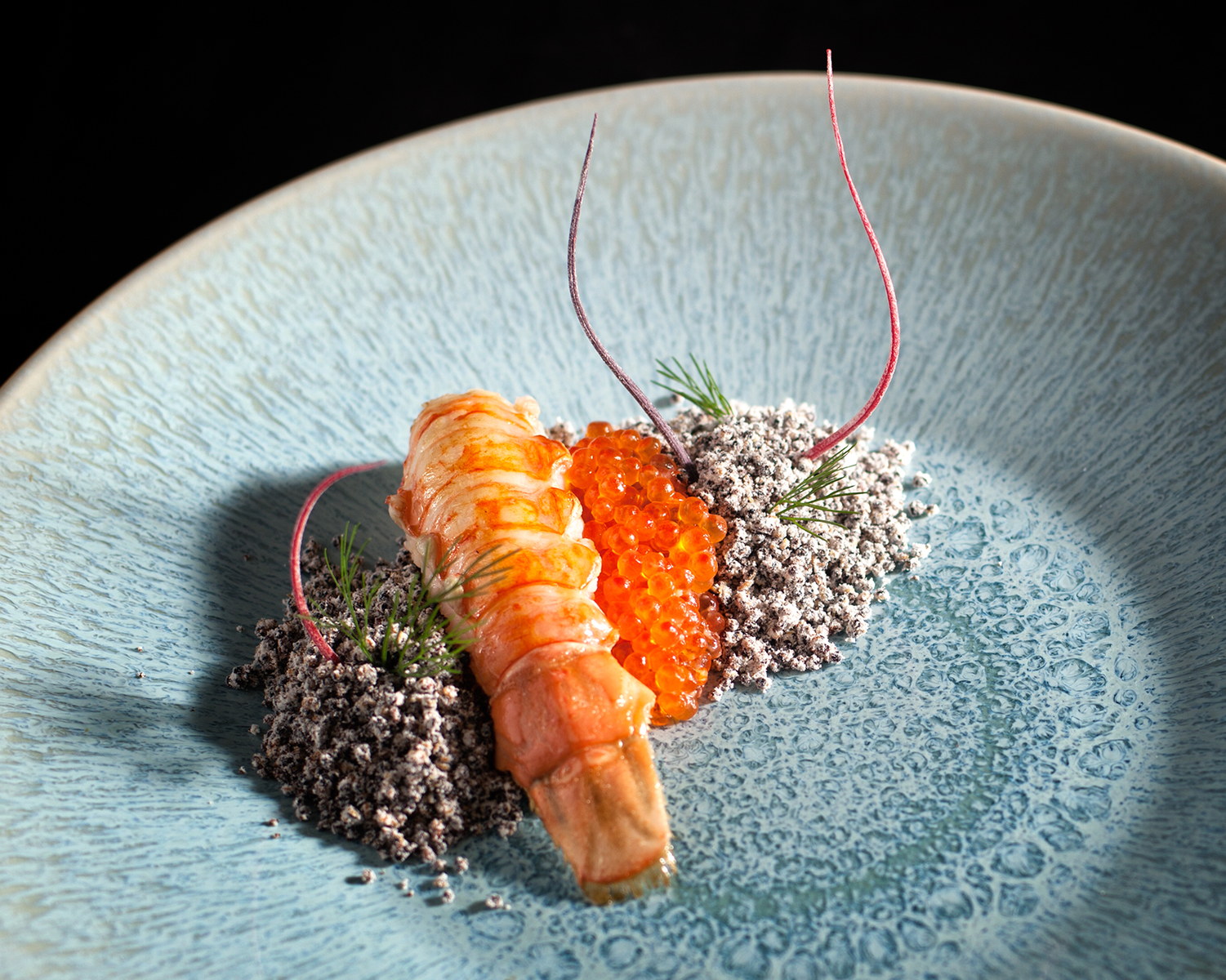 De signature dish van Joris Bijdendijk is geroosterde langoustine met foreleitjes, currycrème en gepofte, wilde quinoa. Voor de camera van Misset Horeca ...