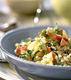 Ingrediënten 500 gr aardappelen 500 gr koolraap Zout Peper 4 bosuitjes 200 gr veldsla 25 gr boter 300 gr shoarmavlees 3/4 dl gezeefde tomaten 5 gr. bouillonpoeder BereidingswijzeMaak de aardappelen en de koolraap schoon, snijd ze in stukken en kook ze in weinig water met zout in ± 25 minuten gaar. Snijd de bosuitjes in