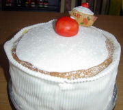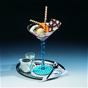 Een bol sinaasappelijs, een bol vanille-ijs en een bol aardbeienijs overgieten met bosvruchtensaus.Garneren met sinaasappel, aardbeien, twee biscuitjes,chocola en een chocoladegelette. Kostprijs: €1,37 Verkoopprijs: €4,31