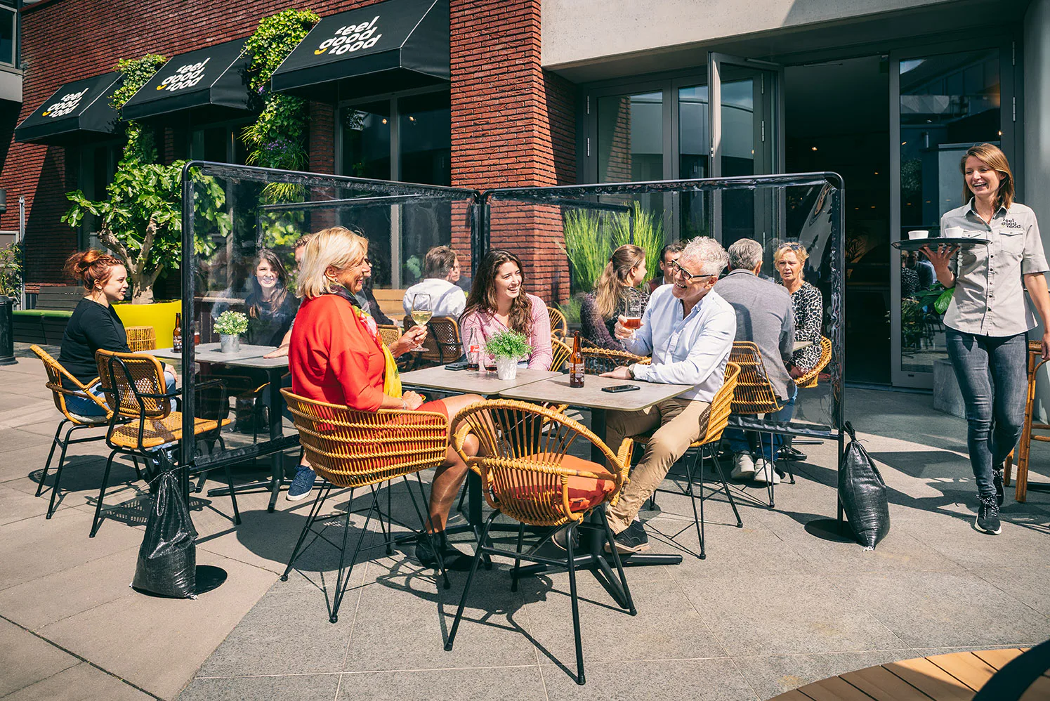 Een scherm op het terras is een alternatief voor de 1,5 meter afstand. Mark Rutte meldde deze versoepeling op 25 juni tijdens de persbijeenkomst. Als er een scherm tussen terrastafeltjes staat, mogen ze in het vervolg dichter op elkaar staan dan 1,5 meter. Misset Horeca verzamelde de op de markt gebrachte 'kuchschermen'. Alle schermen voor binnen en buiten op een rij.