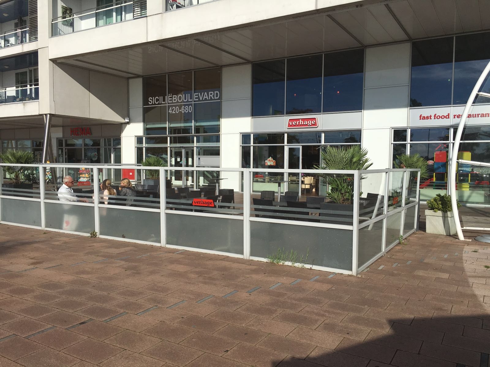 Deze Verhage bevindt zich in het gelijknamige winkelcentrum in Rotterdam. Water aan de voorkant en verder omringd door veel hoogbouw.