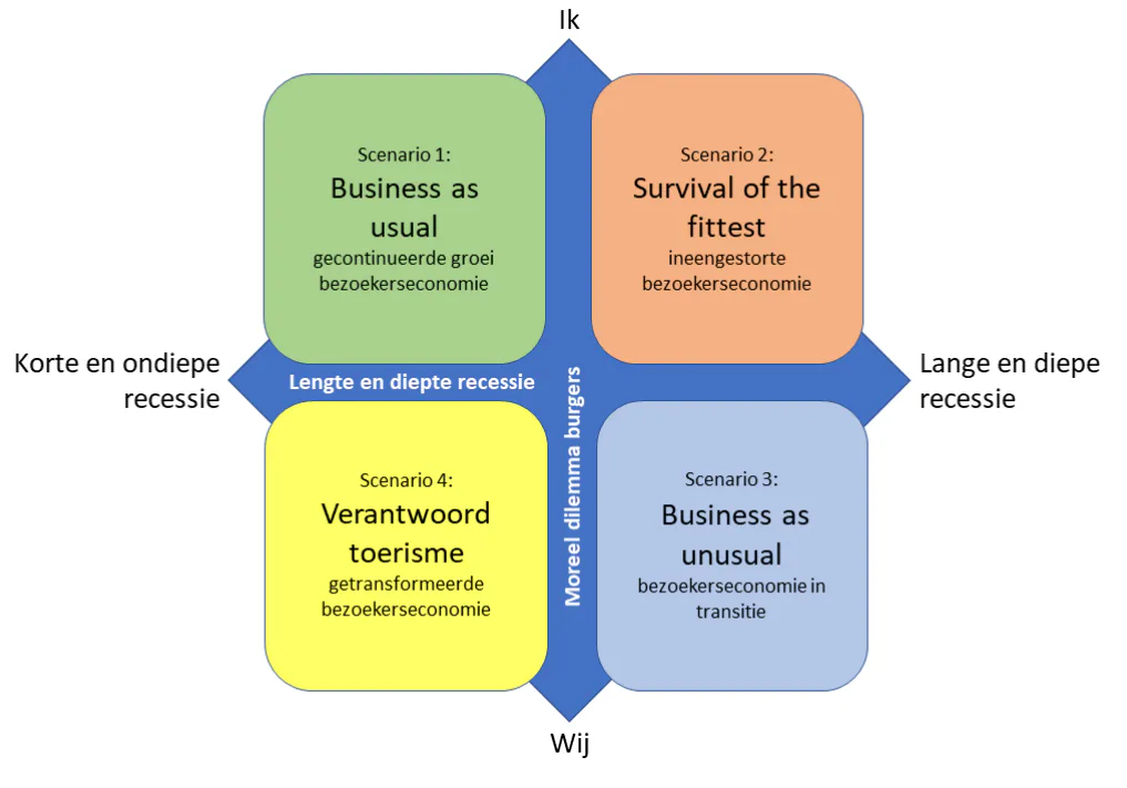 4 scenario's bezoekerseconomie Het Centre of Expertise Leisure Tourism & Hospitality (CELTH) heeft vier toekomstperspectieven ontwikkeld voor de bezoekerseconomie na de COVID-19-crisis.