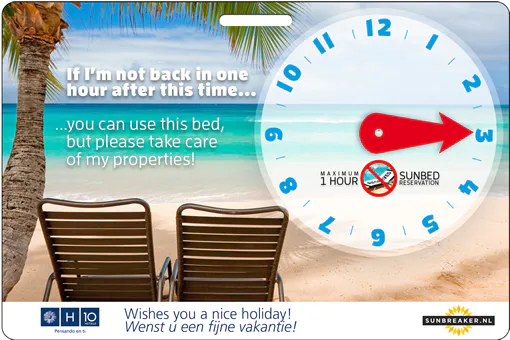 Een parkeerschijf voor ligbedden aan het zwembad. Daarmee is volgens ondernemer Theo van den Dungen een groot irritatieprobleem opgelost; het met een handdoek claimen van ligbedden bij zwembaden.